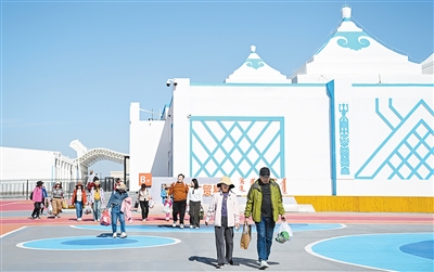 雄伟的策克口岸国门东侧,是一排排商业区,商店、饭店、文化设施等一应俱全,假日里游客众多,热闹非凡;国门西侧,一座座形似蒙古包的白色建筑整齐排列,这就是中蒙边民互市贸易区。策克口岸工作人员张锐介绍,自2014年起,经过持续建设与完善,中蒙边民互市贸易区逐步成形。依托这一平台,口岸常态化举办特色商品展会,聚集了人气,带动了边境旅游。